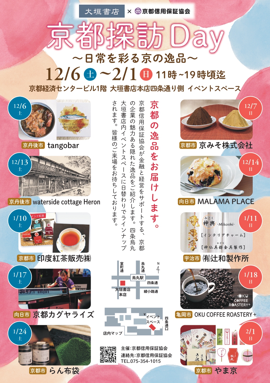 中小企業者への経営支援の一環として、新規顧客の獲得及びマーケティング機会を提供するため、株式会社大垣書店と連携し、販売促進支援事業「京都探訪Day」を開催します。