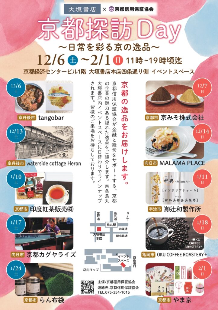 「京都探訪Day」では、大垣書店本店内の専用スペースにて、「日常を彩る京の逸品」をテーマとし、京都府内の事業者の技術や創意工夫によって製造された日常使いができる逸品を日替わりで展示・販売します。ぜひお立ち寄りください。